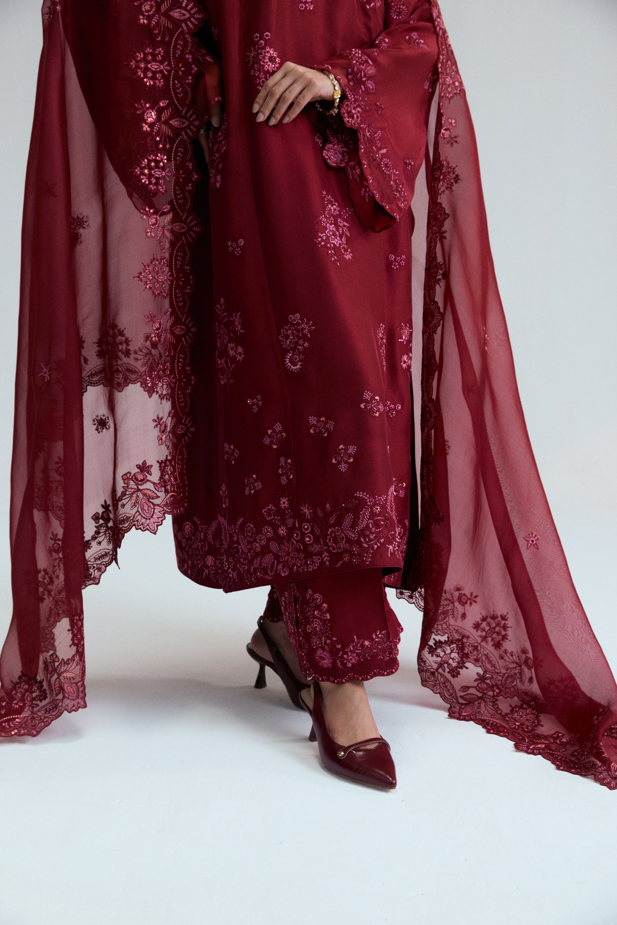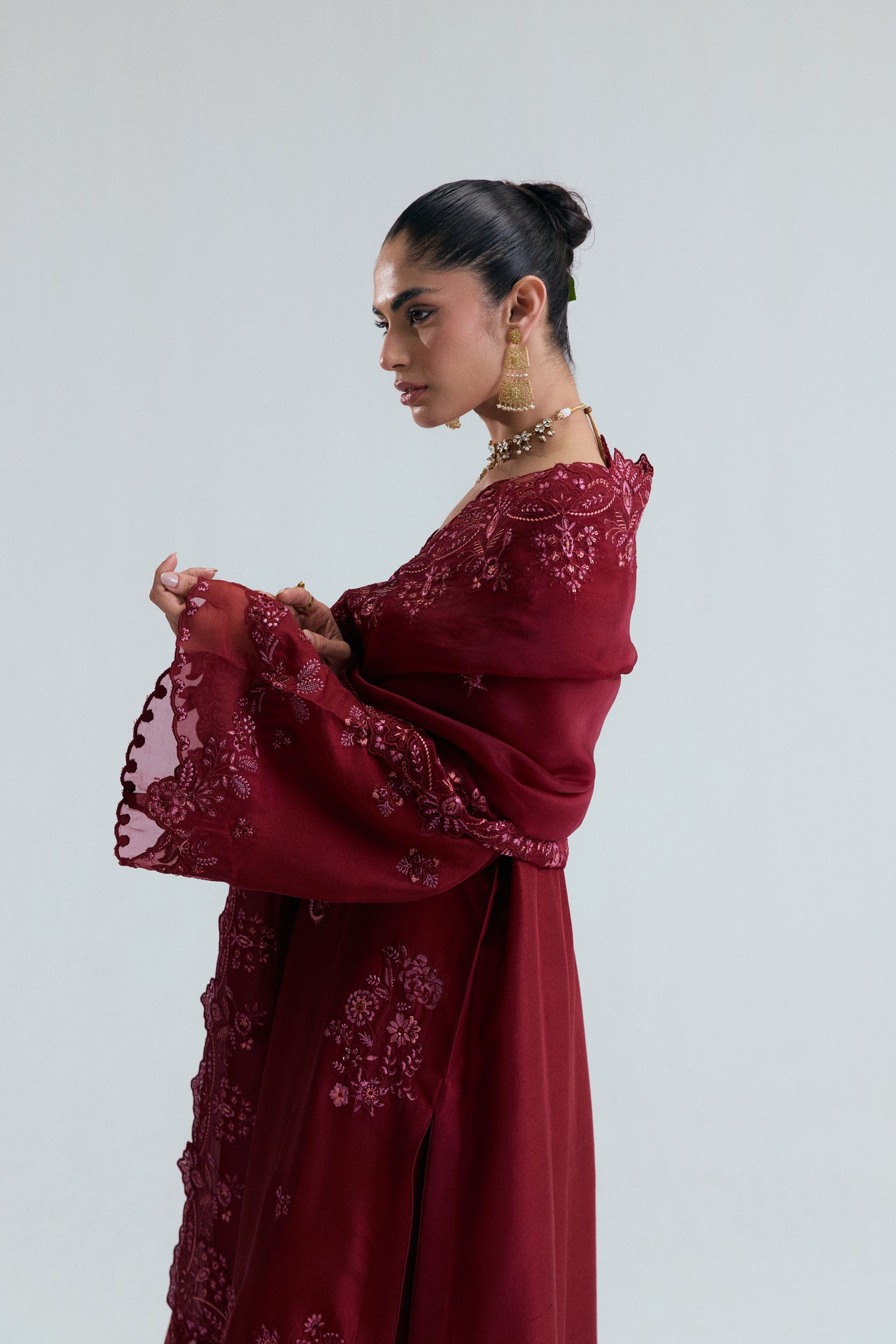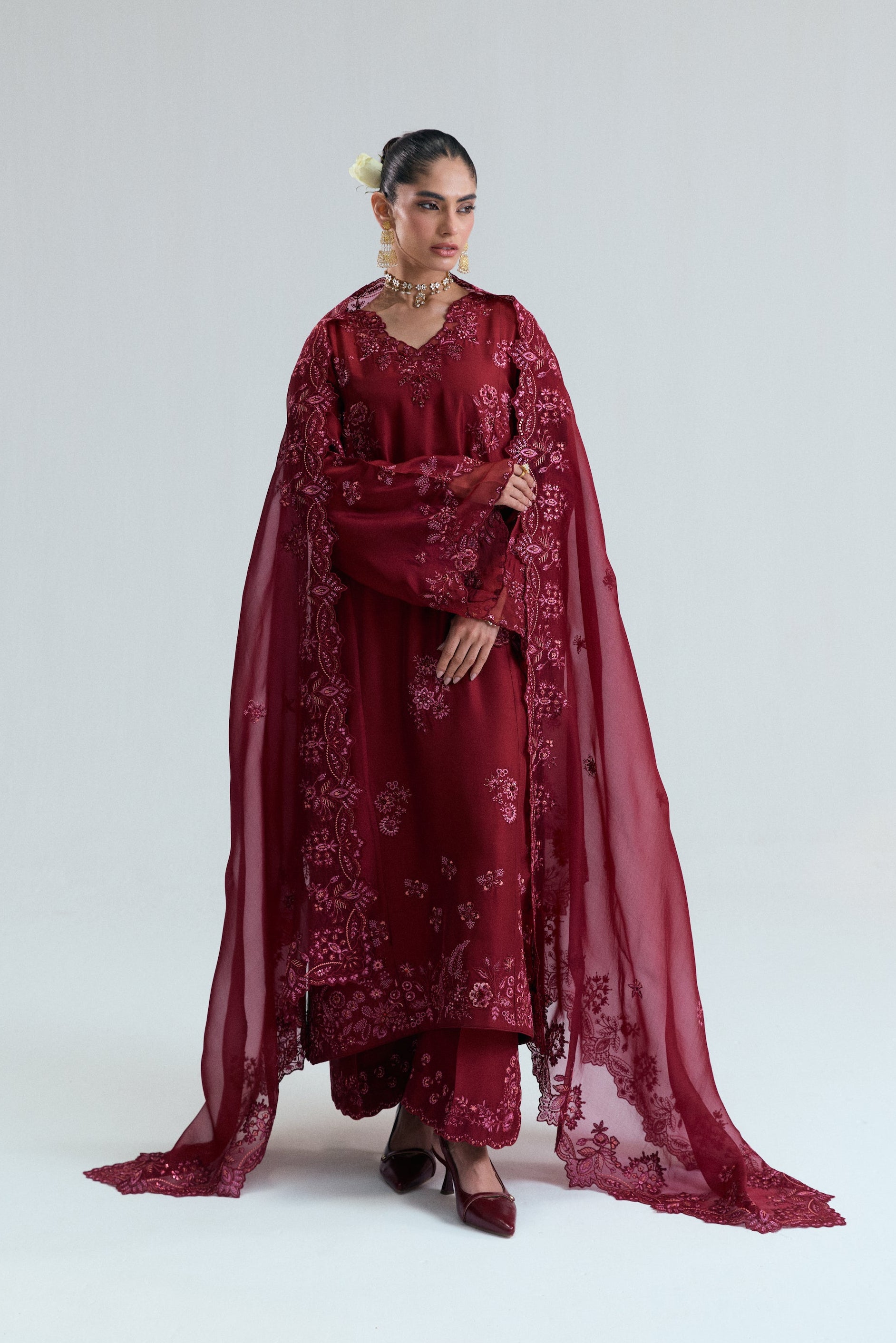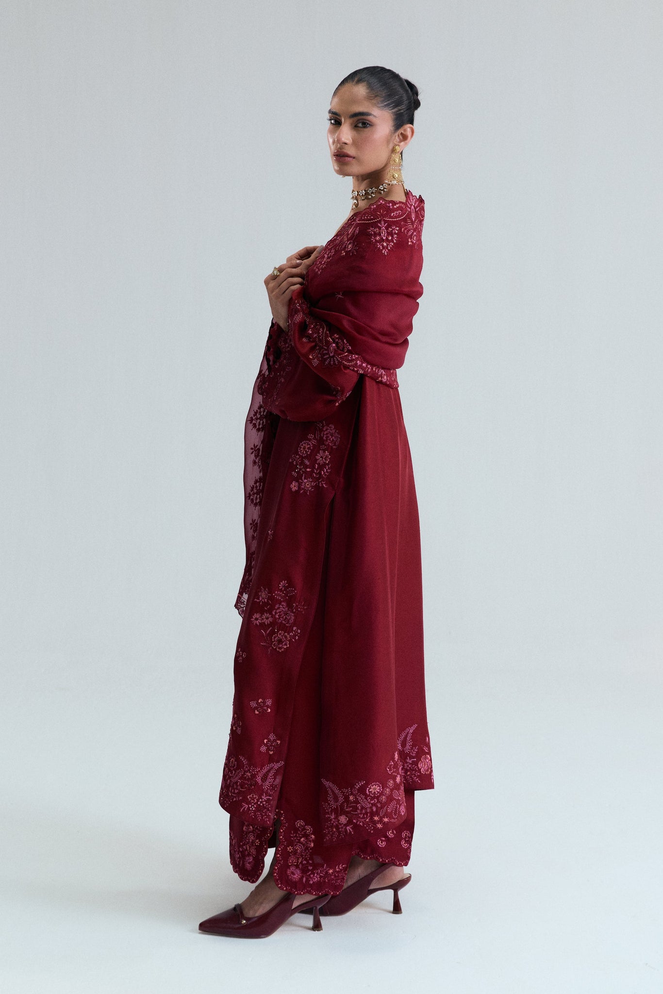 A pure raw silk long kameez, featuring delicate floral threadwork in rich maroon-hues, with textured detailing and sequins, beads and metallic thread embroidery. Complimented by organza finishings to neckline and sleeves..