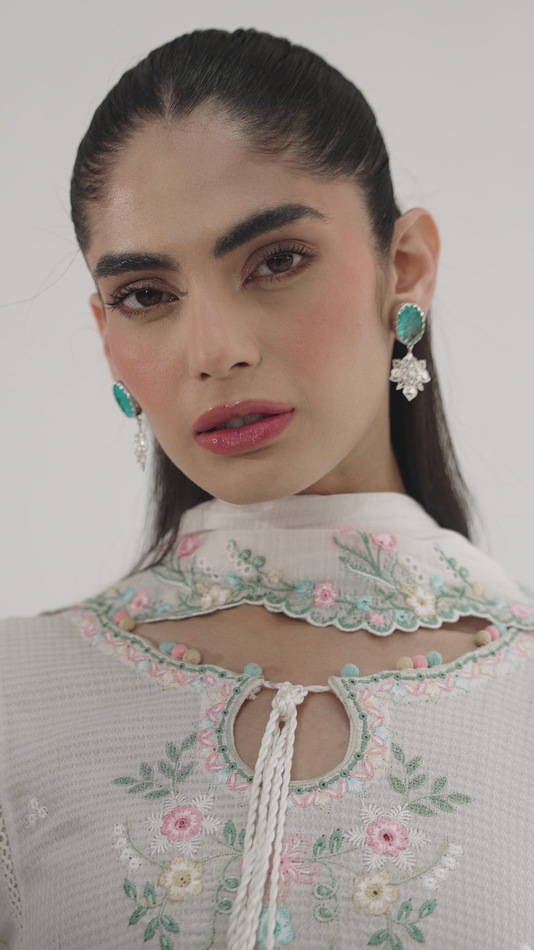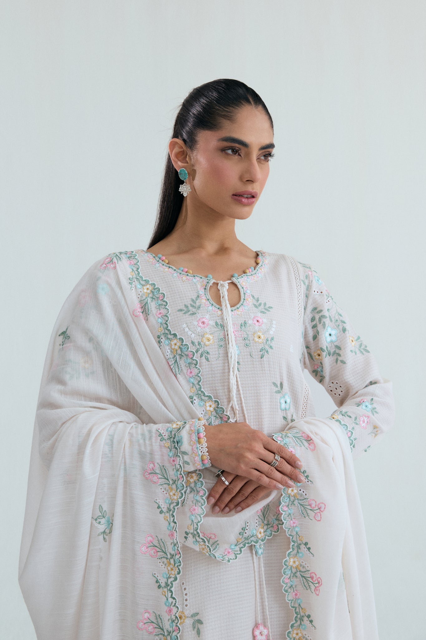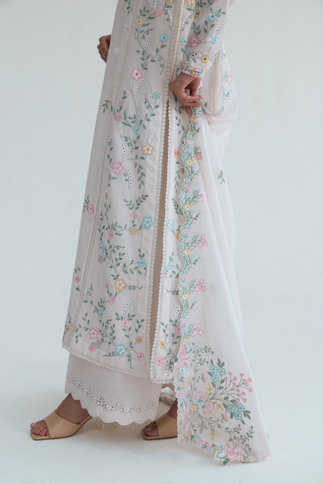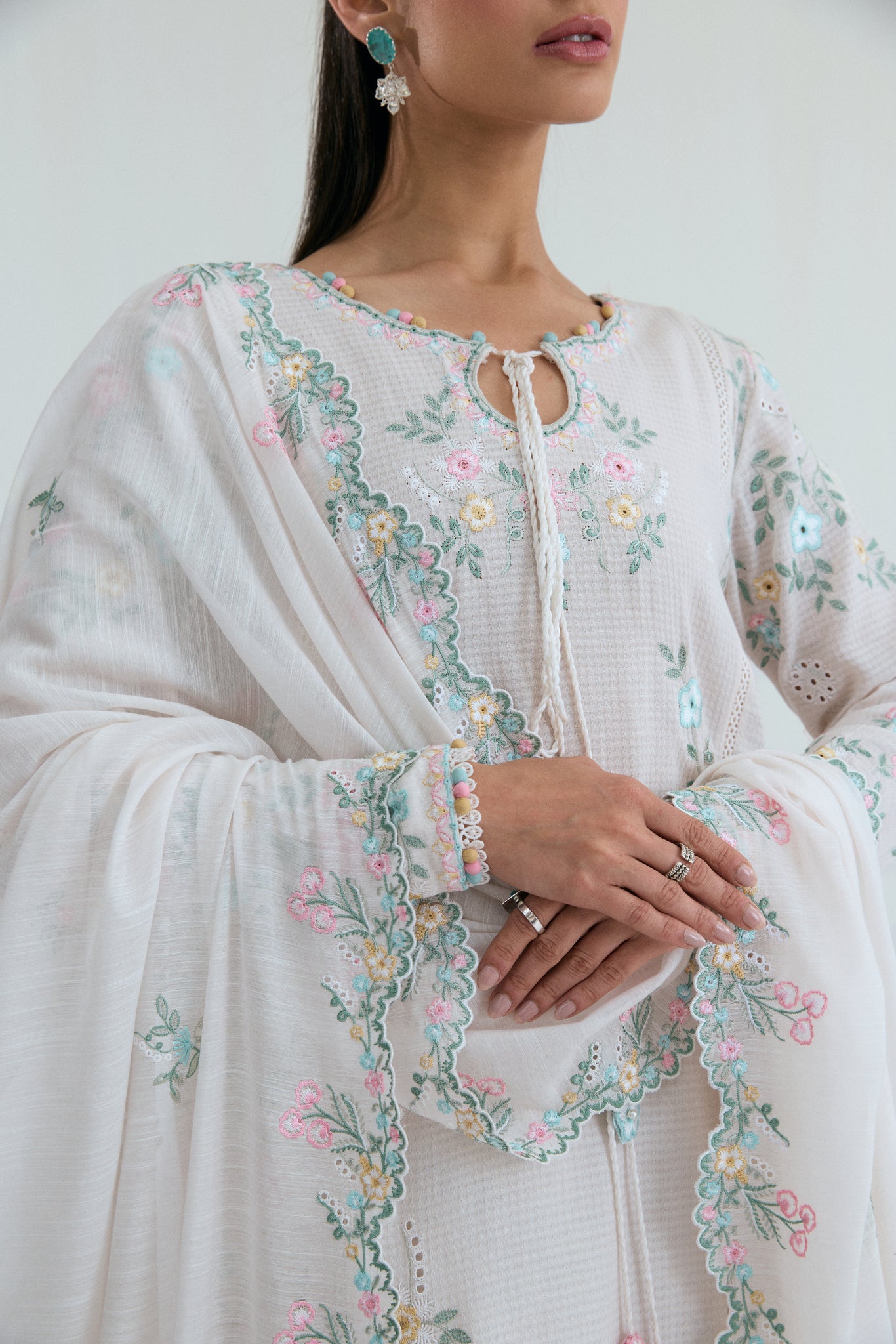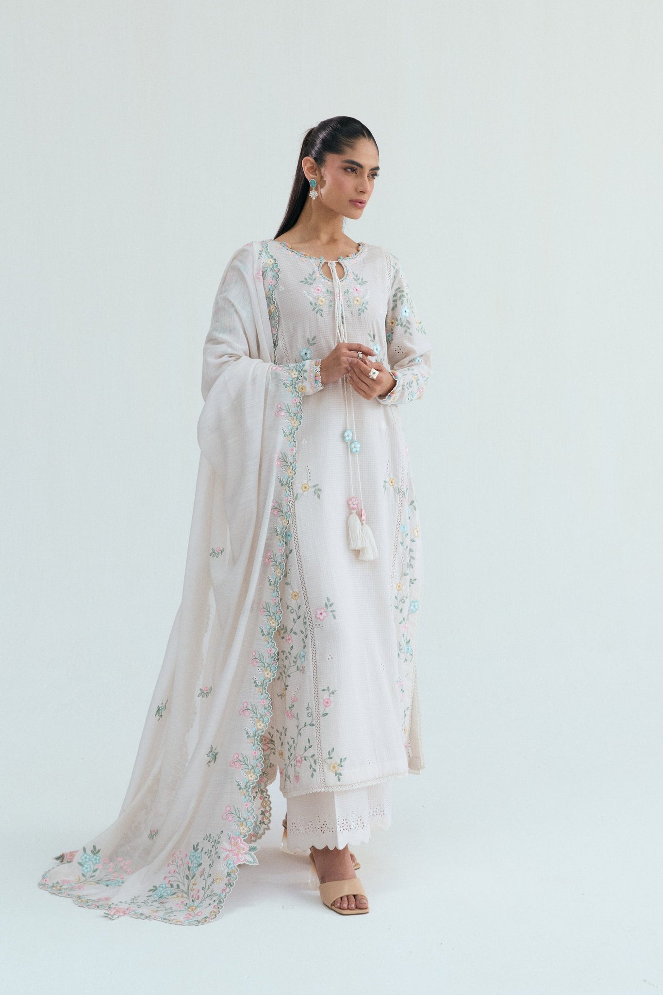 A long off-white kameez featuring cascading floral embroidery across the front and back, finished with an asymmetrical neckline and tapered sleeves with delicate cutwork detailing. Lace accents, soft fabric bubble trims and elongated tassels add movement and elegance to the silhouette.