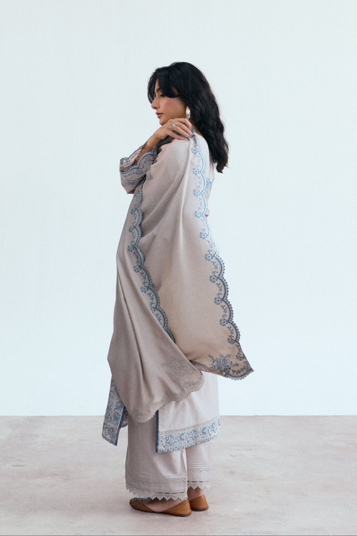 A creamy oat khaddar kameez featuring a notched boat neckline finished with lace and organza trimmings. Features floral embroidery throughout, scalloped sleeves detailed with lace and looped lace accents running along the side seams.