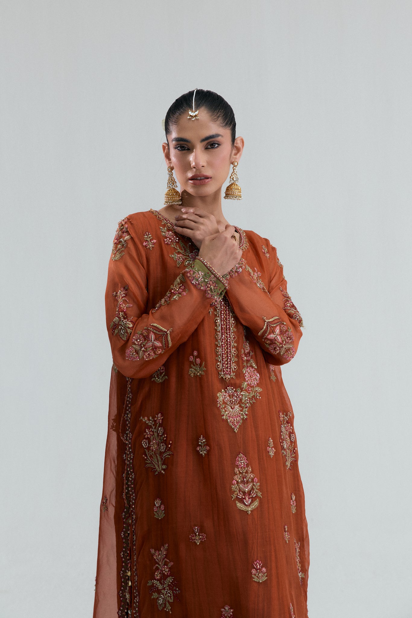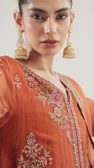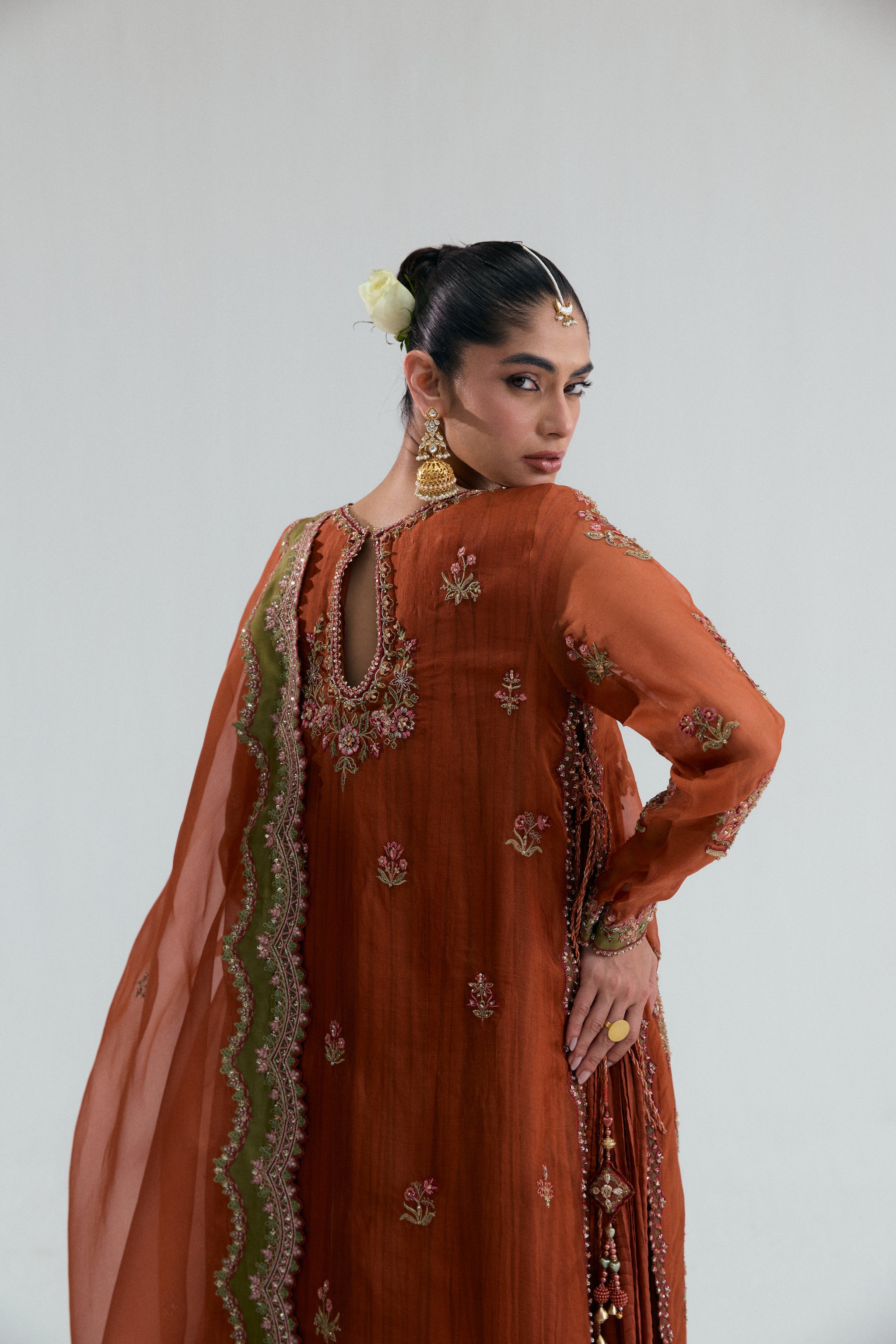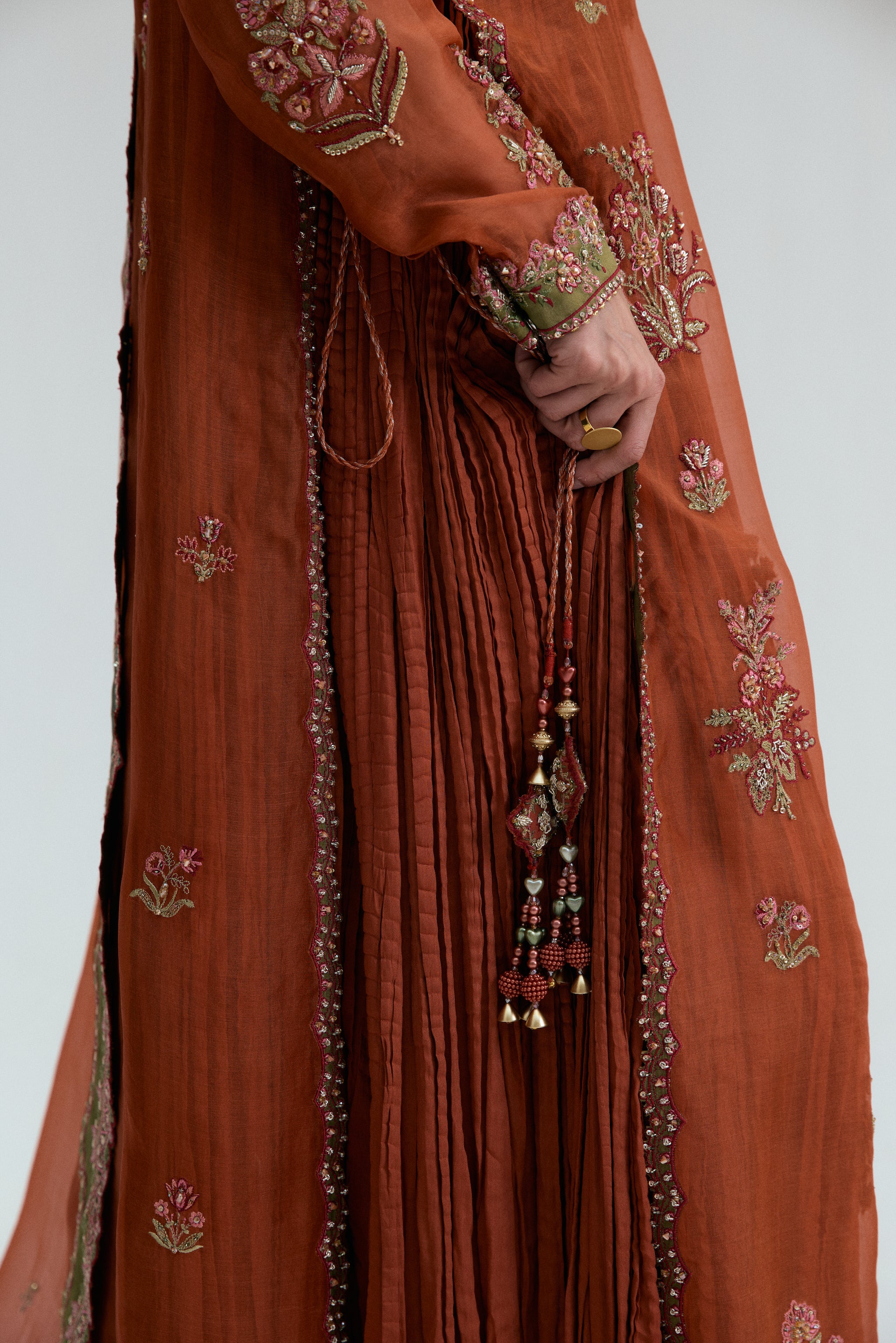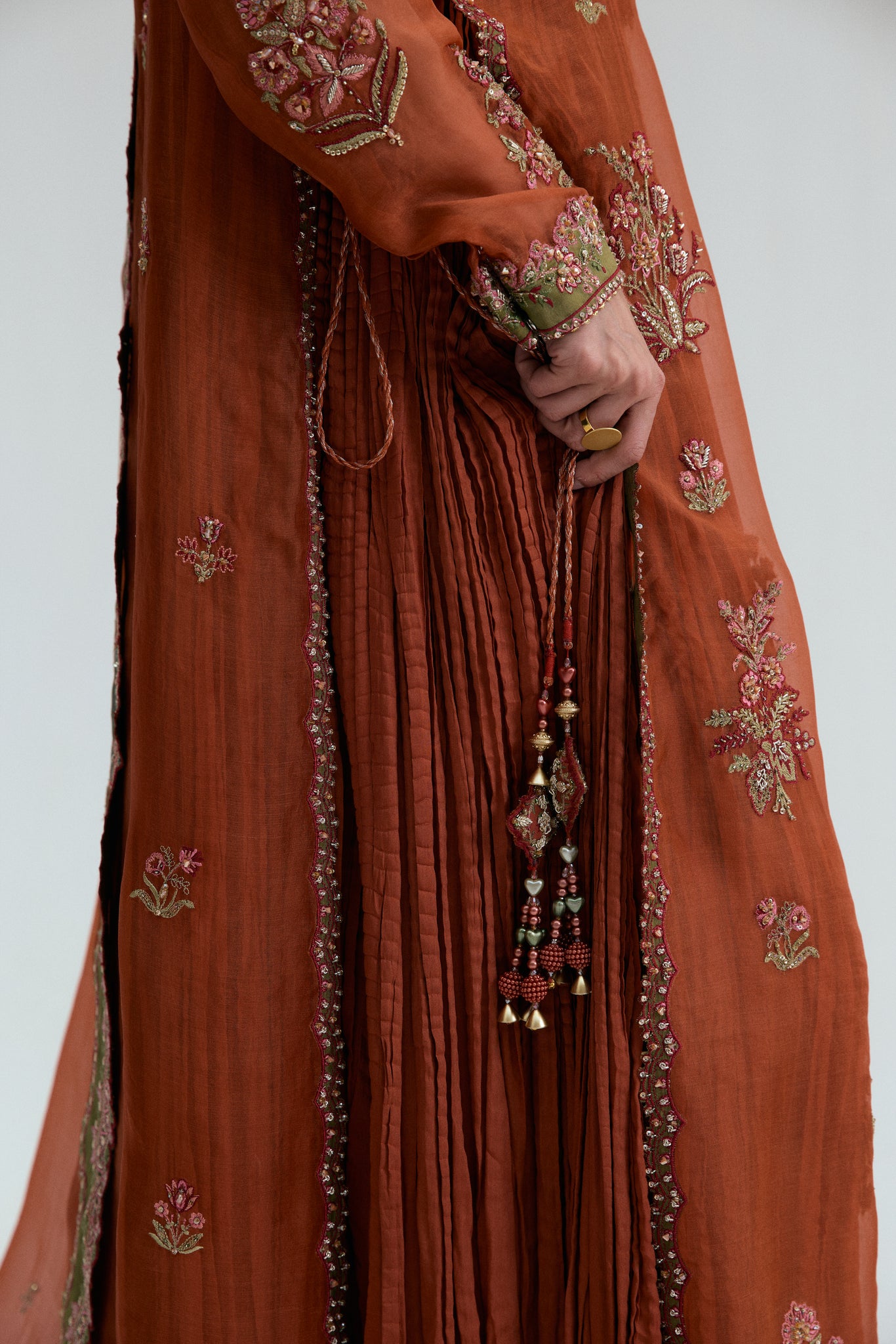 A side-slit formal crafted in burnt orange pure organza, featuring delicate multicoloured floral threadwork and sparkling accents of sequins, crystals and beadwork. The design is enhanced with contrasting scalloped side finishes and hand-embellished tassel details.