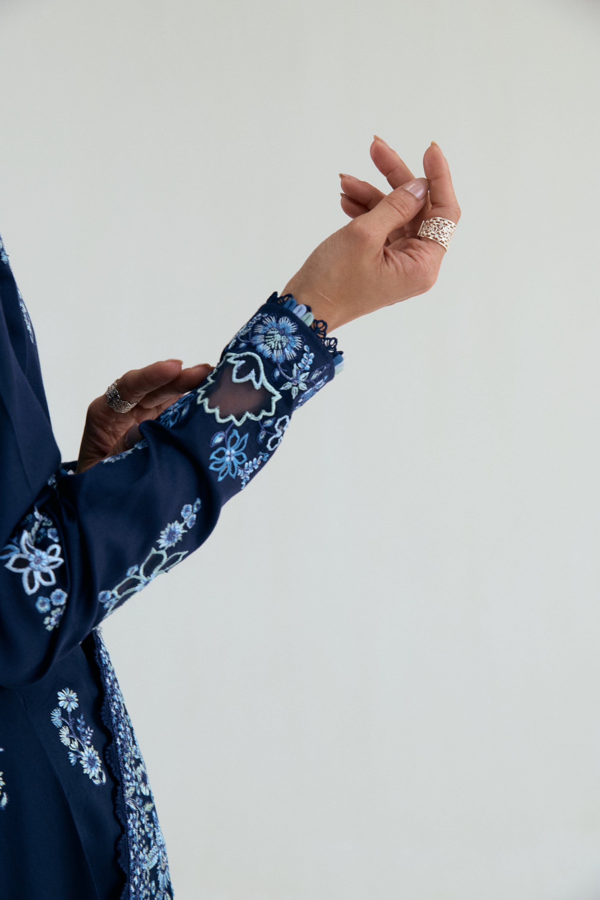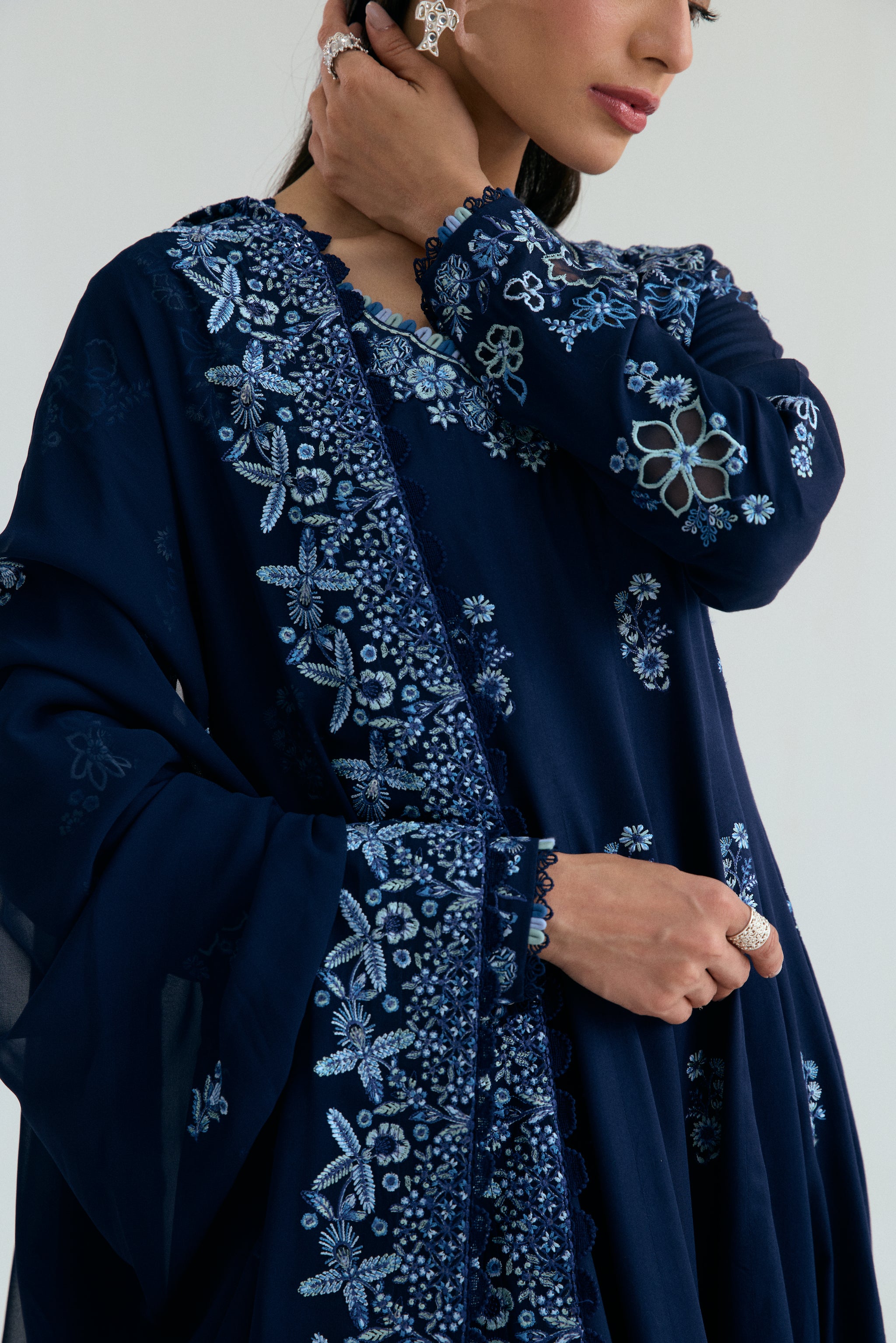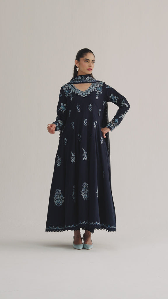 Pure pima cotton Kalidaar, featuring organza appliqué detailing to neckline and sleeves with subtle sequin accents for a soft shimmer. Finished with multicolour loop accents and delicate lace trims along the edges.