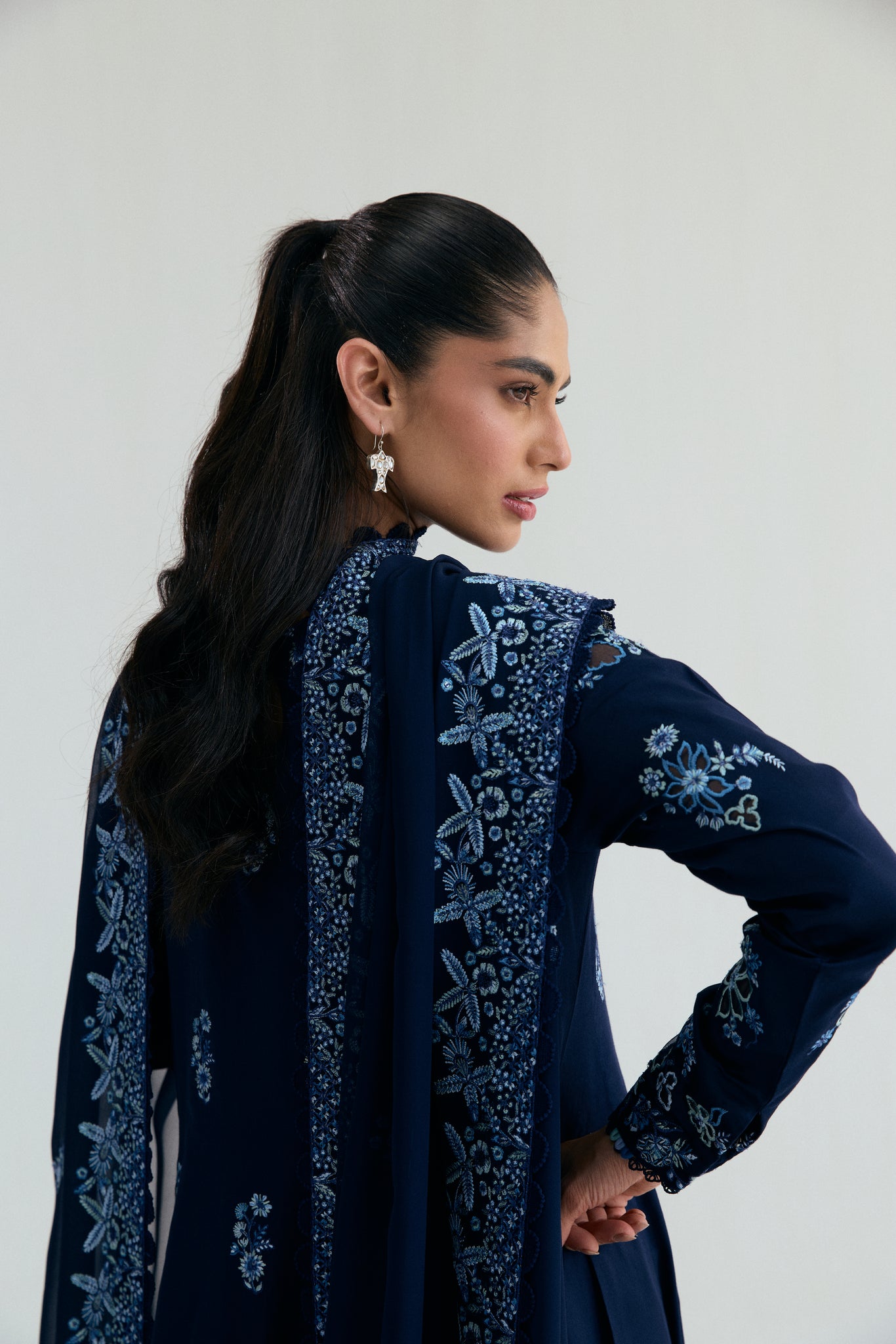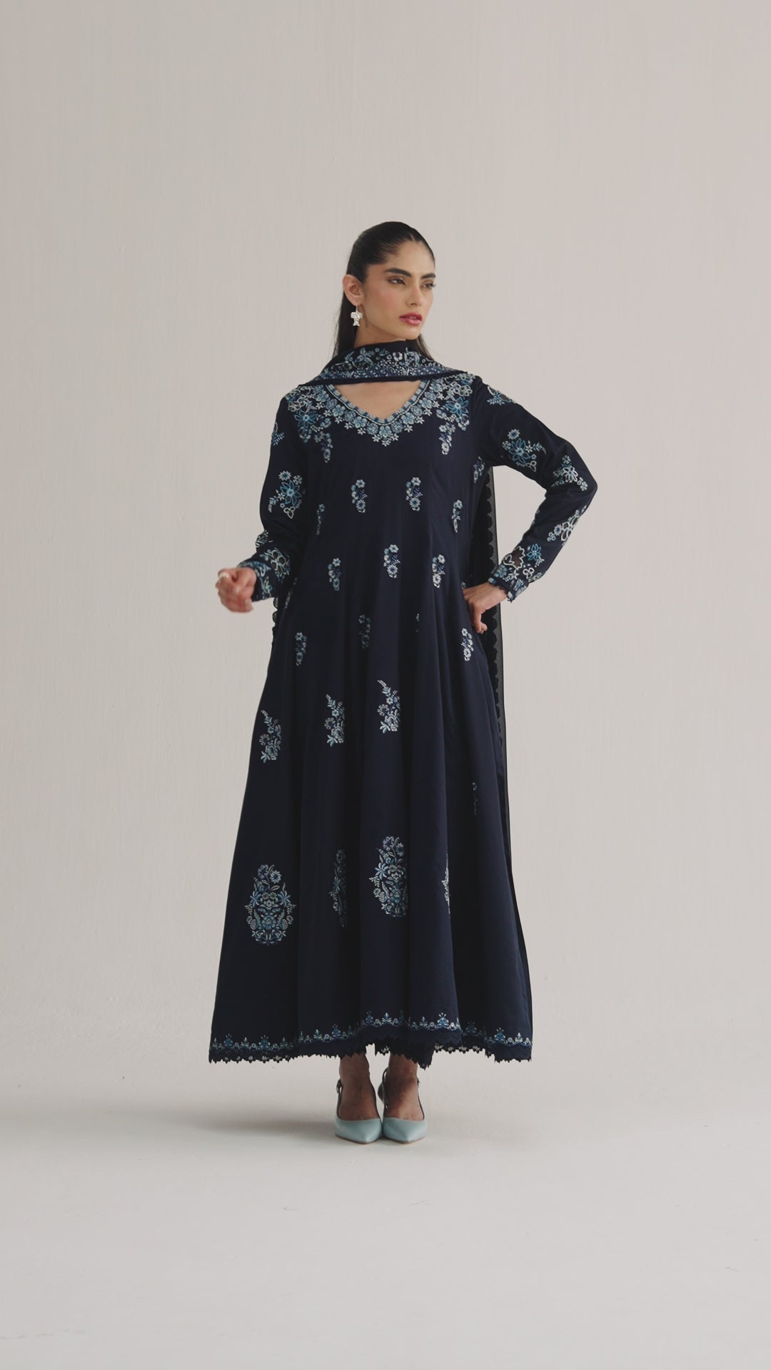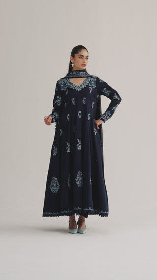 Completed with dupatta, adorned with sequin embroidery and finished with lace edging.