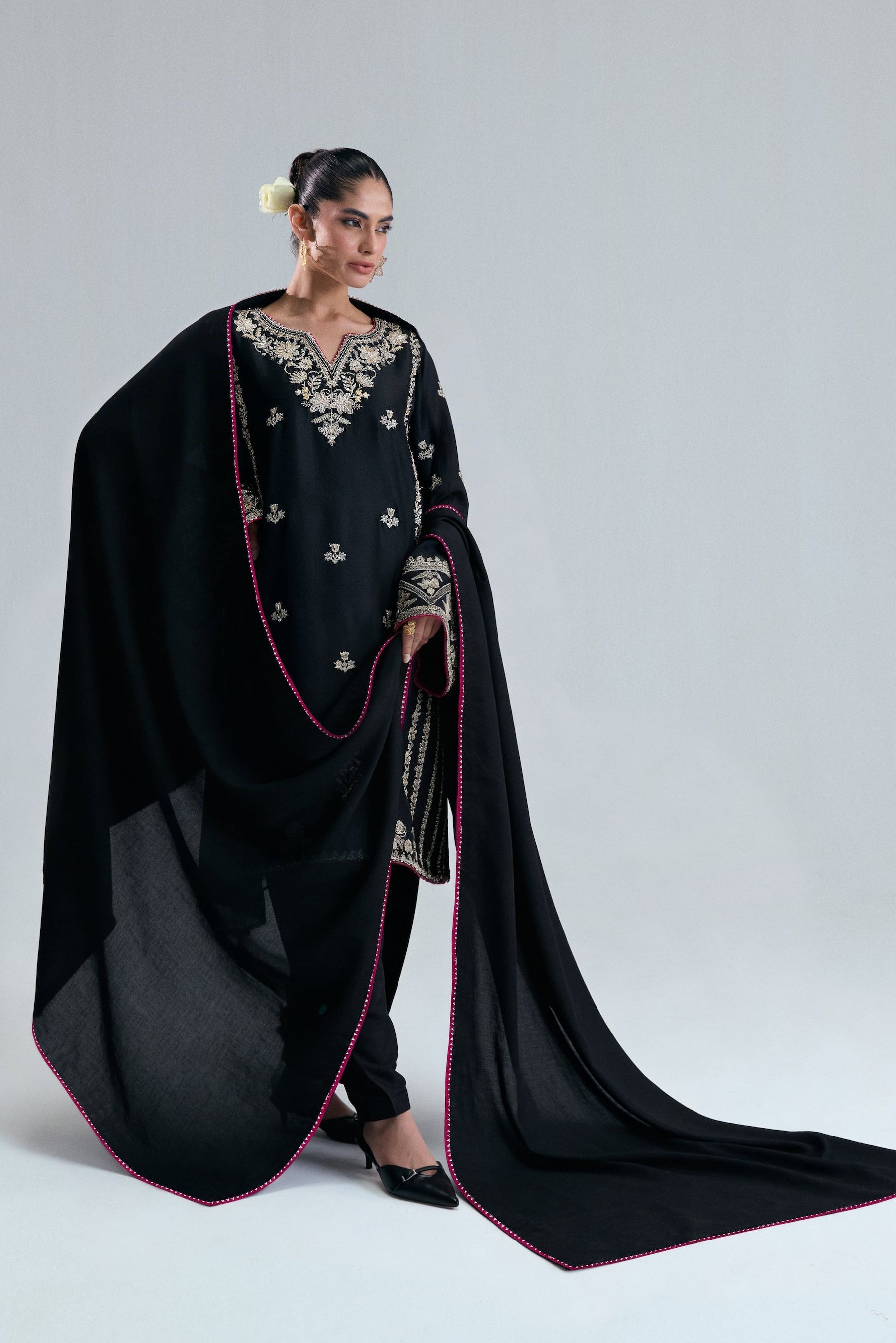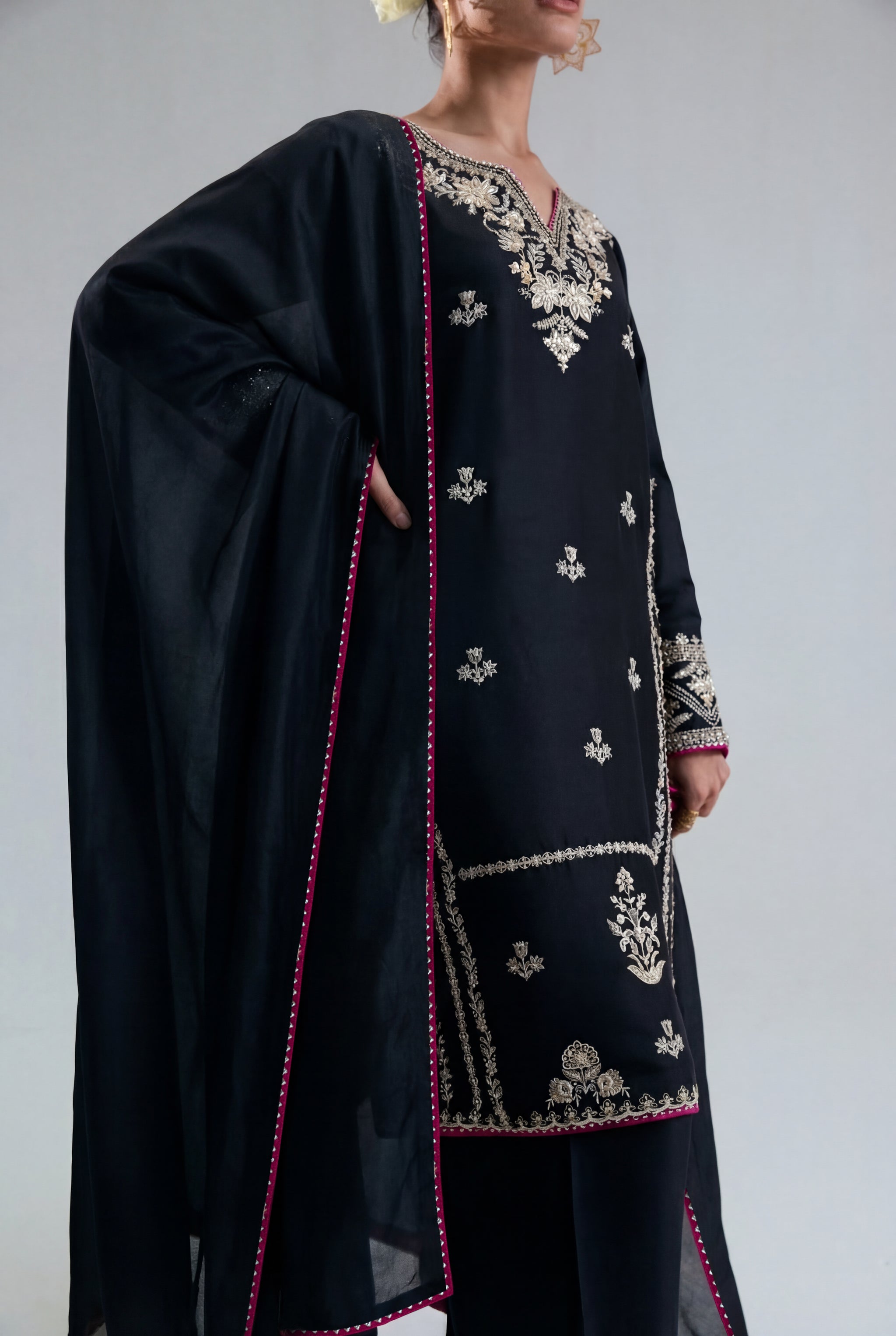 A short Phiran-inspired silhouette crafted in black pure raw silk, featuring delicate multicoloured floral threadwork with sparkling metallic accents and subtle bead detailing. Finished with scalloped lace and soft pink edging for a refined look.